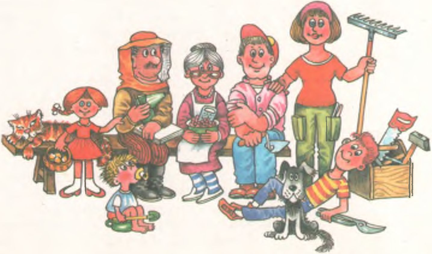 А теперь давайте познакомимся с теми, кто живет и хозяйствует в доме и на усадьбе, кому собственно и адресована книга. Вот эта семья: старшее ее поколение, молодые — муж с женой, дети. Пусть художник изобразил их чуть шар- жированно, с улыбкой и добрым юмором, они, конечно, в чем-то похожи на нас с вами, и заботы у них те же. Потому в преддверии этой книги пожелаем ее читателям, чтобы «дом и усадьба» и «дом с ухожами» были не только синонимами в Толковом словаре В. И. Даля, но и равноценными понятиями, реальным тождеством во всей нашей жизни.